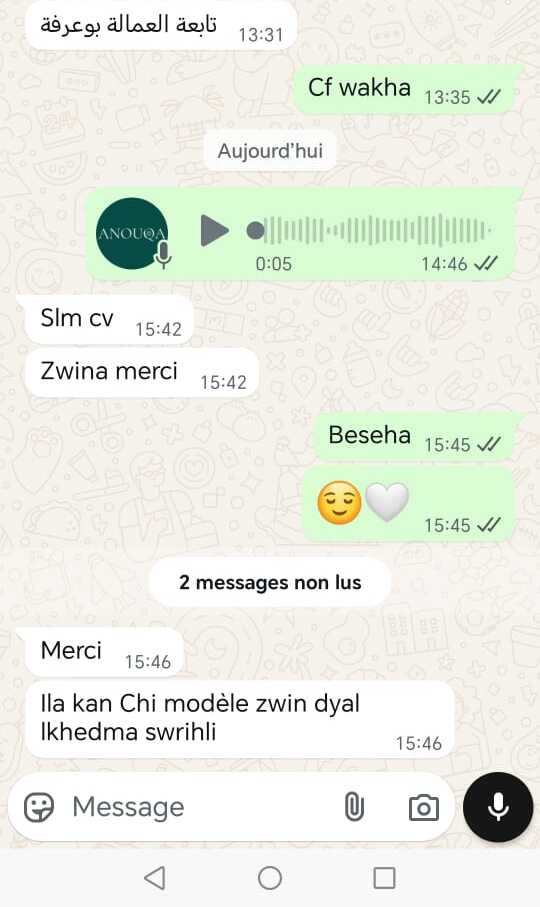 Zwina bzzaf, merci! Ila kan chi modèle zwin dyal l’khdma, swirhli