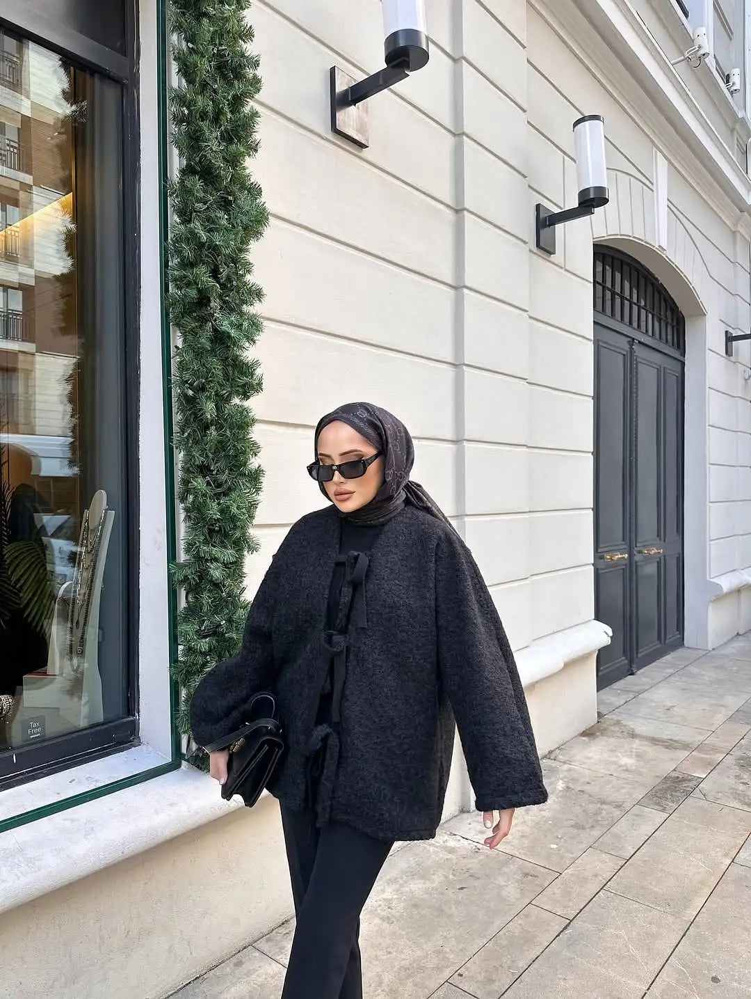 نسّقي Veste Kimono Lamis مع بنطال أسود وحذاء أنيق، وأكملي الإطلالة بحجاب بسيط لإحساس بالفخامة اليومية.